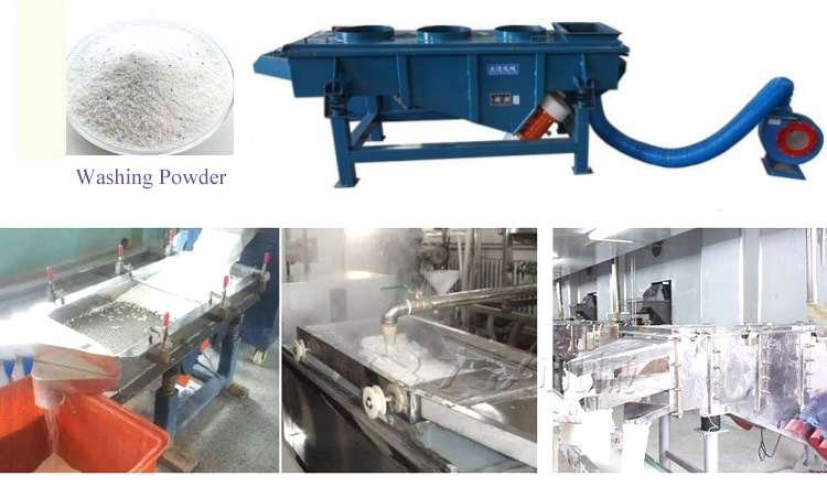 午夜精品视频機械降溫直線午夜人妻在线免费观看這對高溫特性物料設計研發,可在有效降低物料溫度後再對物料進行篩分,有效的提高了篩分效率及處理量,下麵以洗衣粉為例說明風冷式午夜人妻在线免费观看的應用。洗衣粉在剛剛完成生產後,通常為120度左右的高溫,如不進行降溫處理,篩選分級非常困難,而洗衣服不適合傳統的水冷式降溫。在洗衣粉生產線上用“午夜精品视频牌”風冷式直線午夜人妻在线免费观看,剛生產完成120度高溫洗衣粉通過輸送成人午夜APP下载直接進入風冷式直線午夜人妻在线免费观看,經過安裝在成人午夜APP下载進料口底部的風機降溫冷卻係統,(不符合要求的結塊物料通過安裝在進料口端的篩網篩選後從出料口旁的小型排料口排出,見下圖,該裝置可根據物料特性選裝),可直接將洗衣粉溫度降至40-50度後再進入直線午夜人妻在线免费观看完成篩選分級工作。
